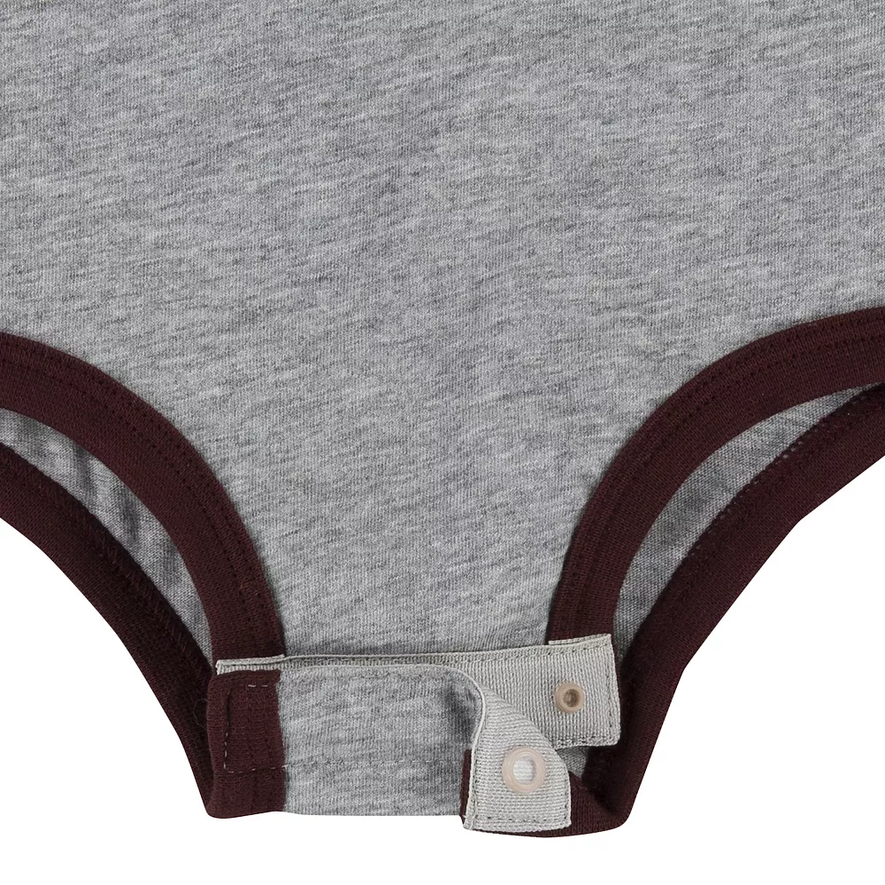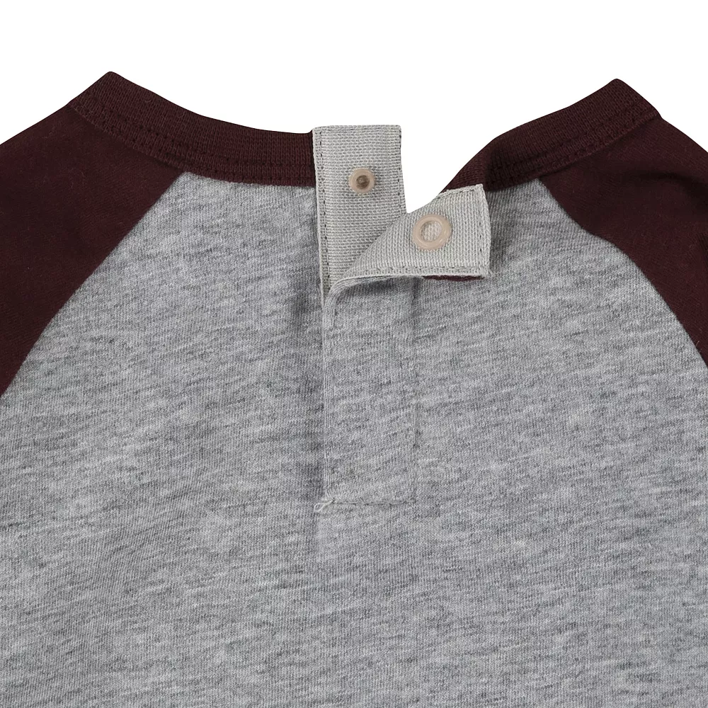 - Bodysuit: crewneck, long raglan sleeve, lap shoulders, graphic on chest, snap gusset