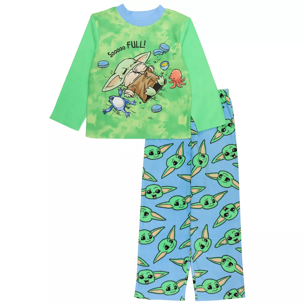 The force is strong with this cute boys’ The Mandalorian Grogu “Soo Full” 2-piece pajama set featuring Baby Yoda and his favorite snacks.