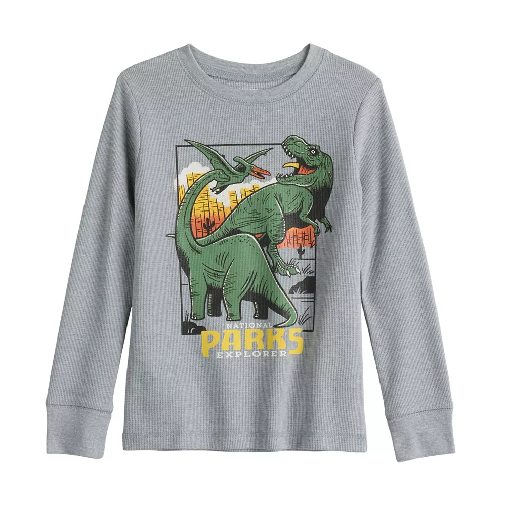 He’ll be ready to take on the great outdoors in this boys’ thermal dinosaur graphic tee from Jumping Beans.