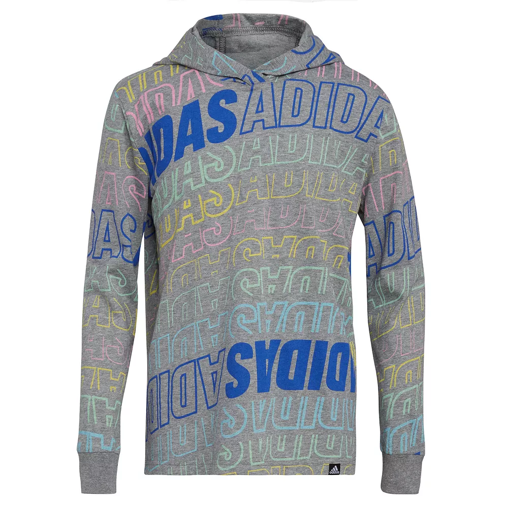 He’ll get the message across with this soft and sporty adidas warped heather hooded graphic tee.