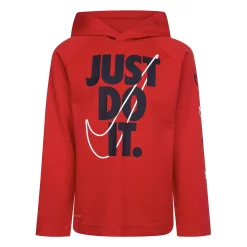 With its moisture-wicking, thermal construction, this boys’ hooded long sleeve graphic tee from Nike will keep him comfy all day long.