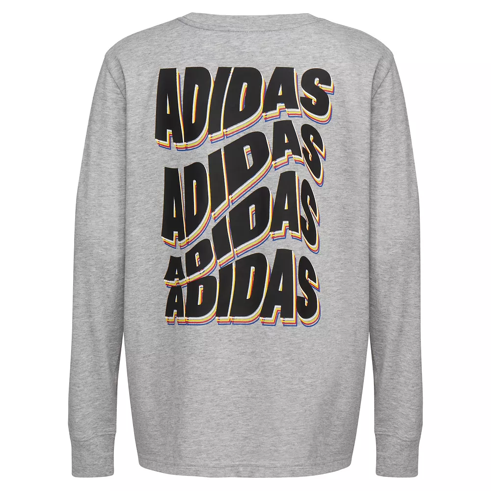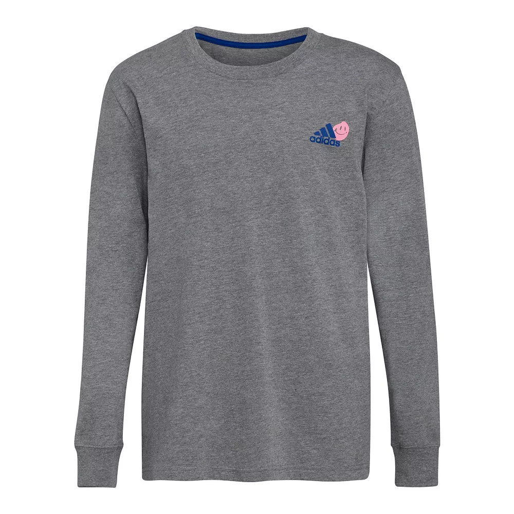 adidas gets wiggly with a ripple graphic on the back of this boys’ long sleeve t-shirt. On the chest, a smiley face peeks out from behind the Badge of Sport logo. The cotton-blend jersey is soft and comfy, and durable enough to wear and wash again and again.