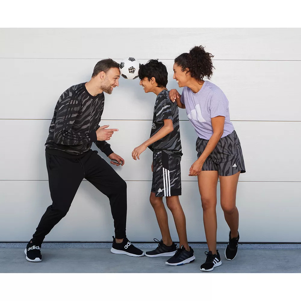 He’s not the shy type. Let him stand out wherever he goes when he wears these boys’ shorts from adidas. An allover tiger camouflage print gives him a wild style while adidas 3-stripes keep his look sporty.