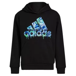 Caution: wet paint. This boys’ pullover fleece hoodie shows off a swirly adidas Badge of Sport graphic with a freshly painted look. It’s made of soft fleece to keep him warm.