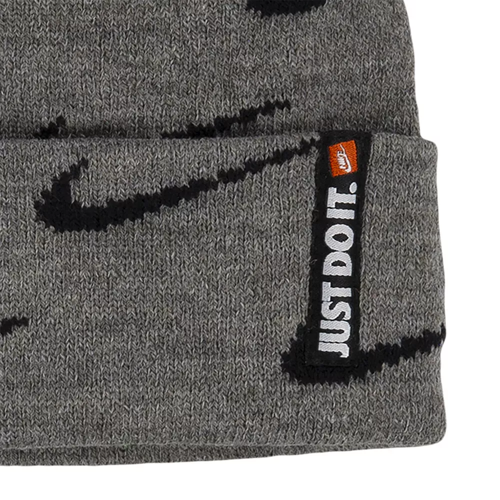 - Beanie: soft cashmere-like fabric, cuffed bottom, allover Swoosh print, “Just Do It.” patch at the front