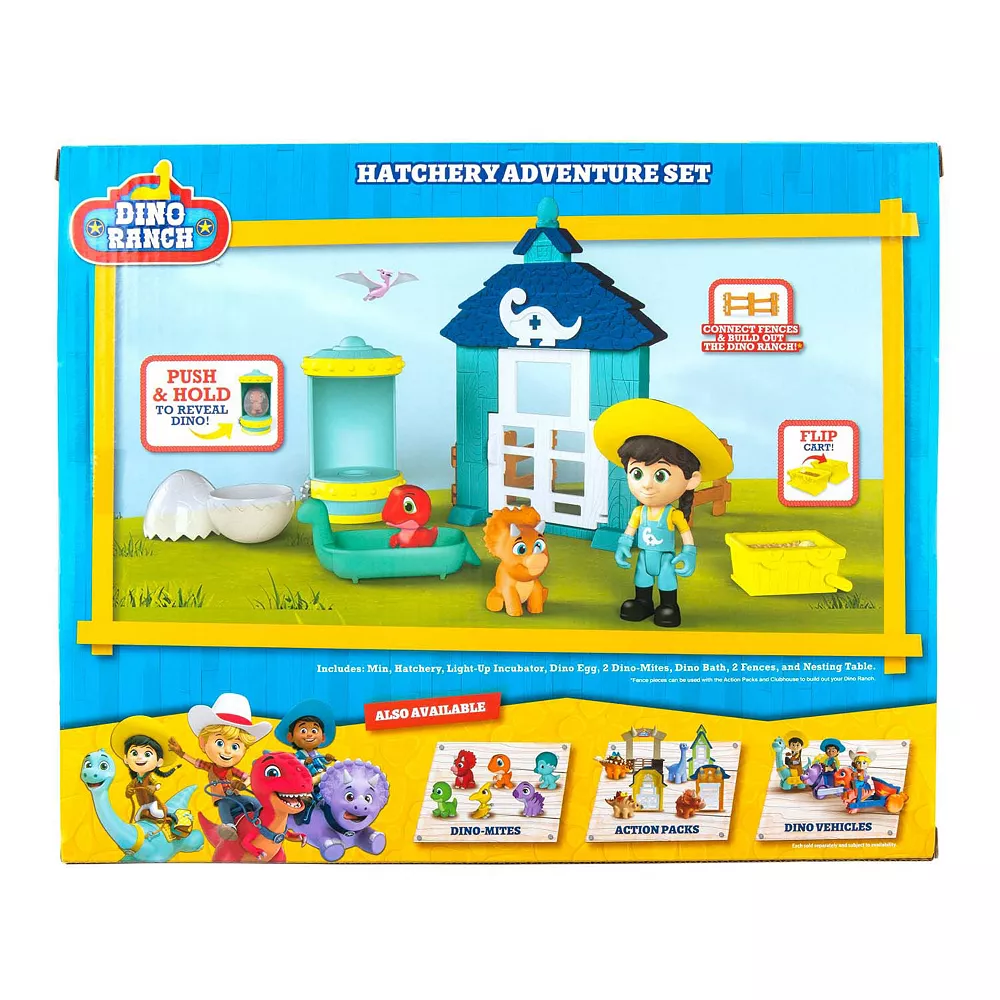- 7-Inch Hatchery Facade with Attachable Fence, 3-Inch Exclusive Min Figure, with Removable Hat, 2 2.5-Inch Baby Dinos, Light Up Egg Incubator, 6 Dino Ranch Accessories