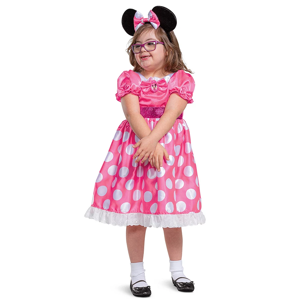 - AUTHENTIC ADAPTIVE MINNIE MOUSE DRESS – Child Minnie costume dress includes velour sparkle bodice, character cameo, satin organza polka dot skirt and pair of Minnie ears