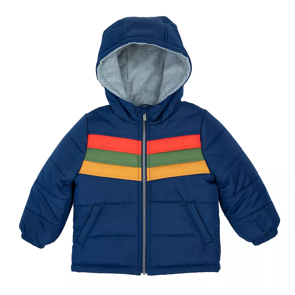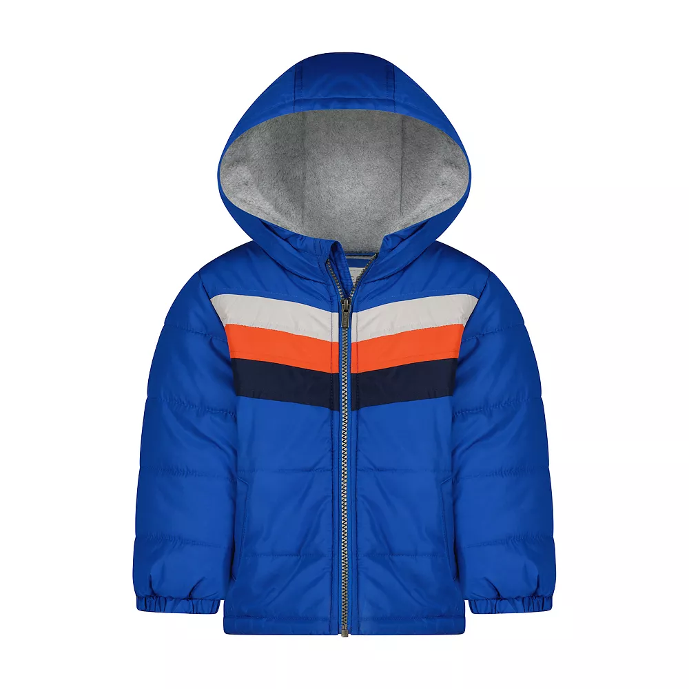 Make sure your little man stays warm and cozy in this fleece lined toddler boys’ colorblock puffer coat from Carter’s.