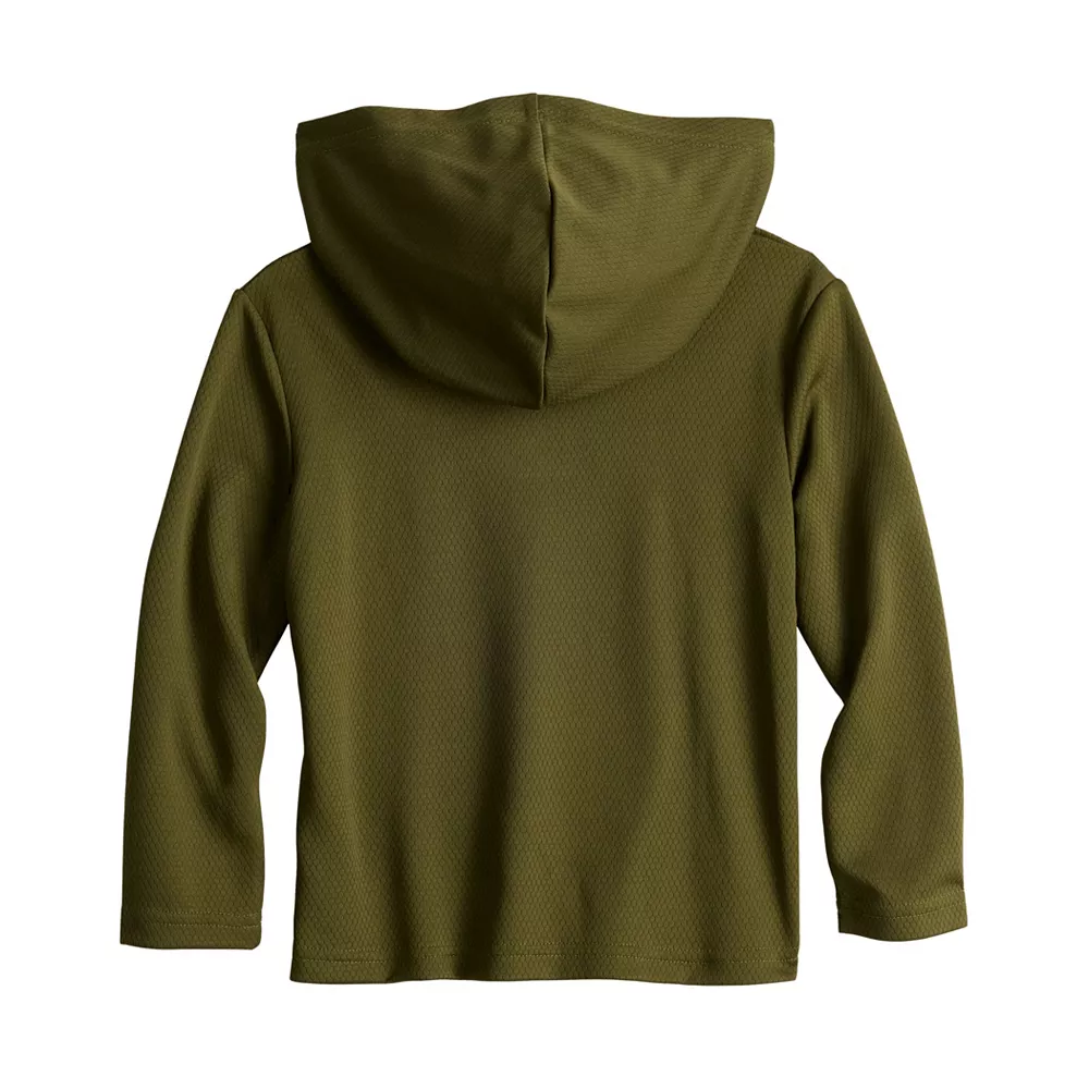 He’ll be ready for playtime in this toddler boys’ hooded active graphic tee from Jumping Beans